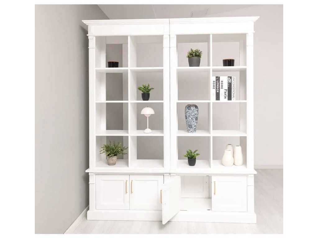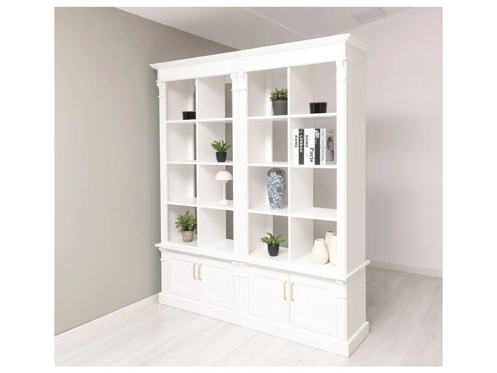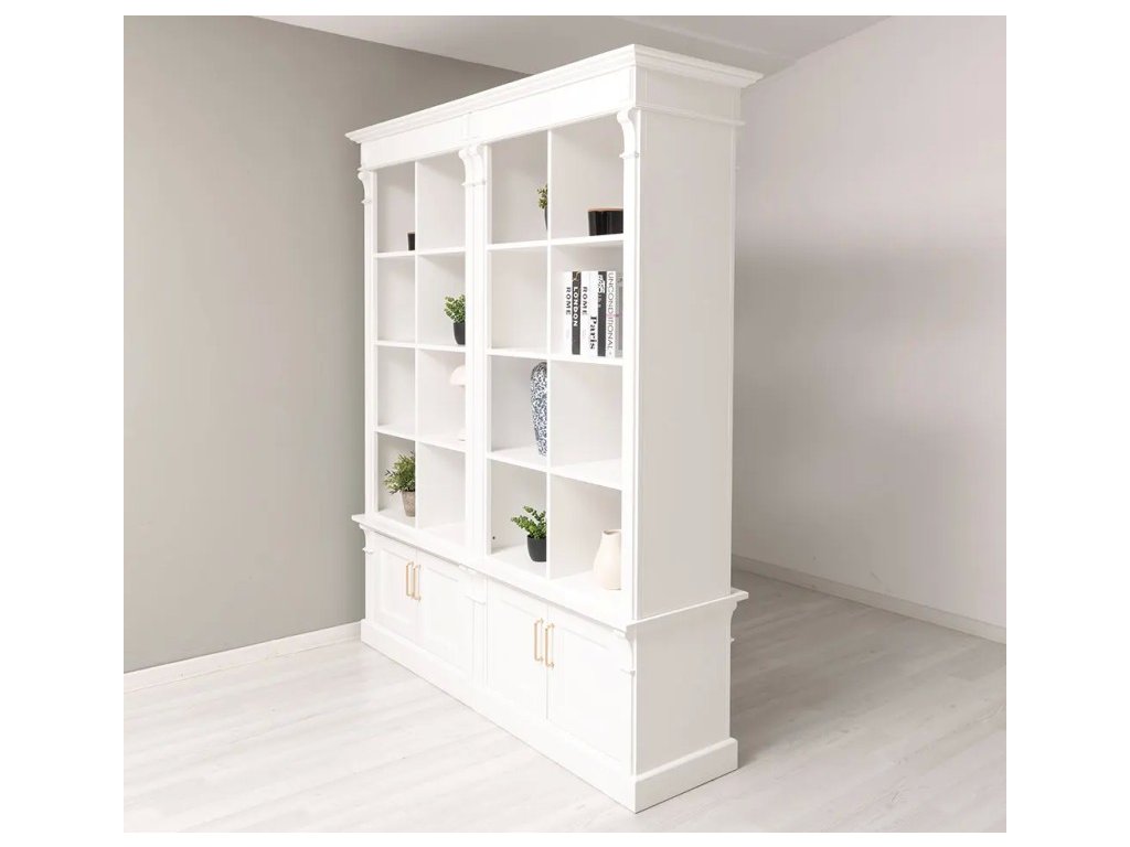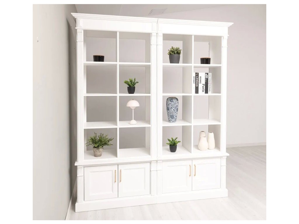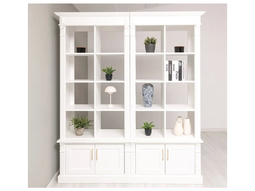 dřevěná knihovna se 4-mi plnými dvířkya otevřeným prostorem 2x 3 police otevřenémateriál borovicebarvy dle vyobrazení - bíláRozměry : Délka: 174 cm / Hloubka: 53 cm / Výška: 220 cm