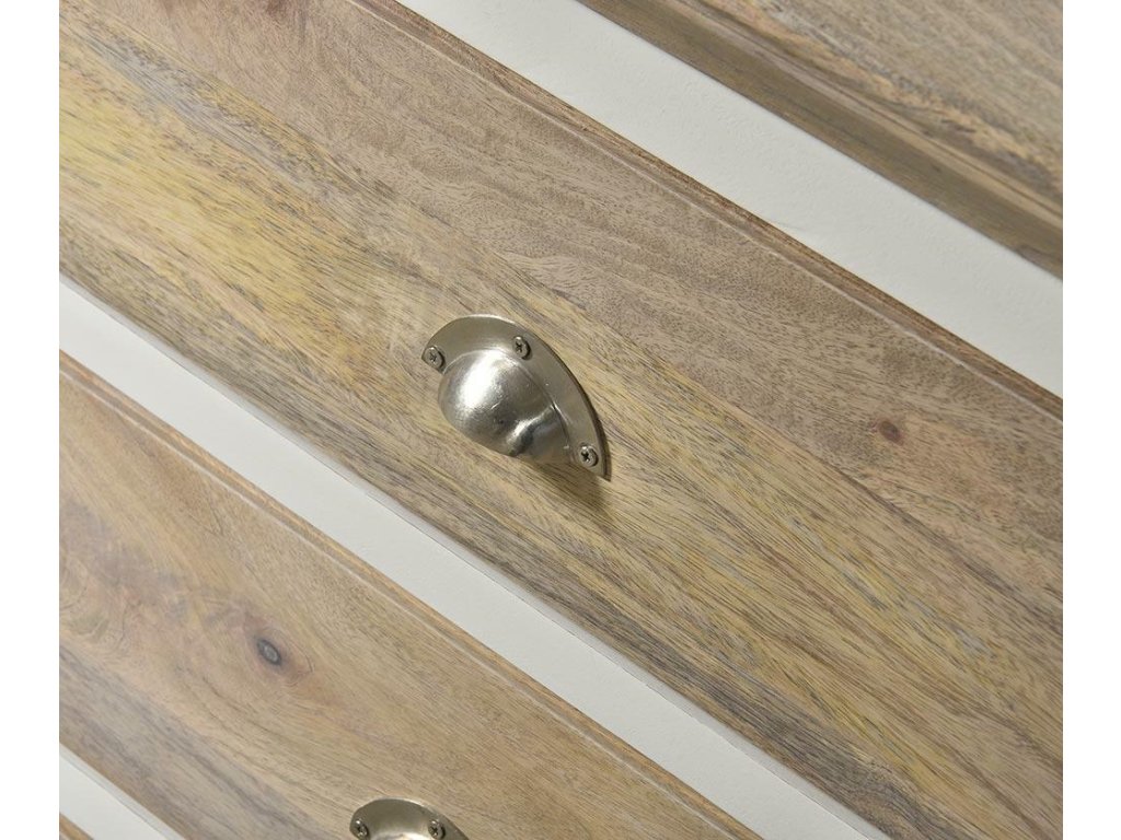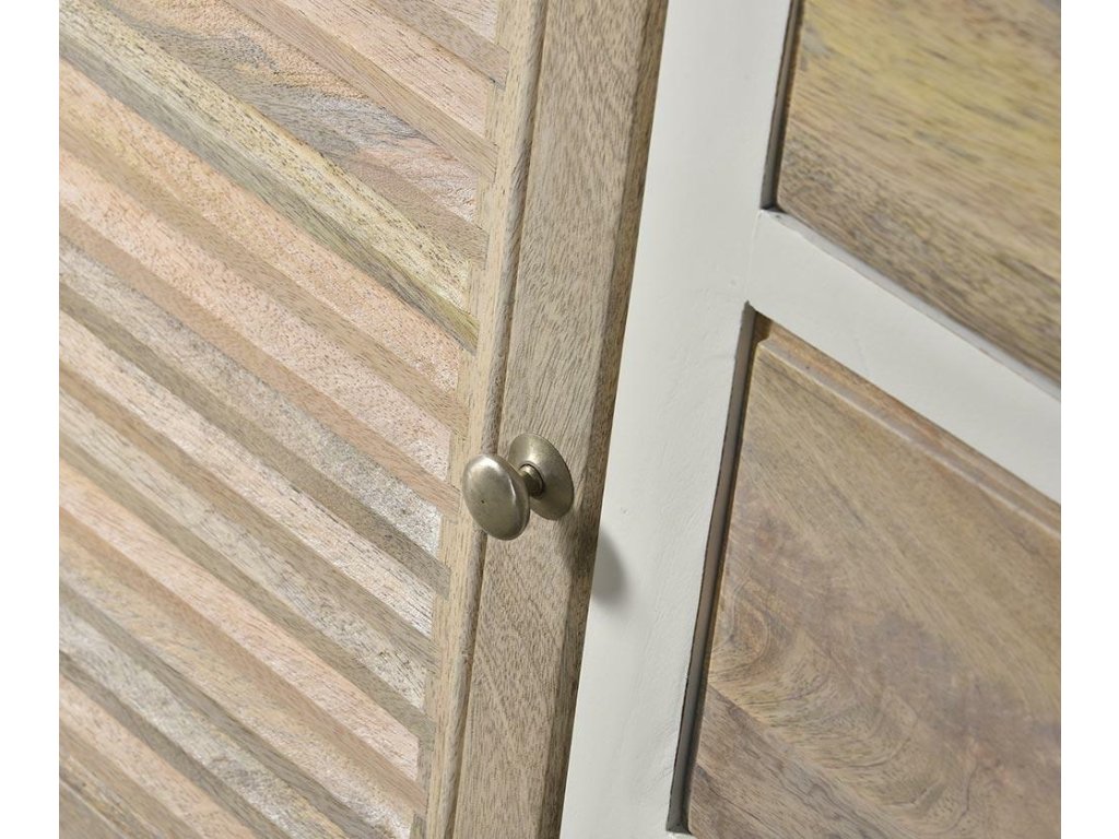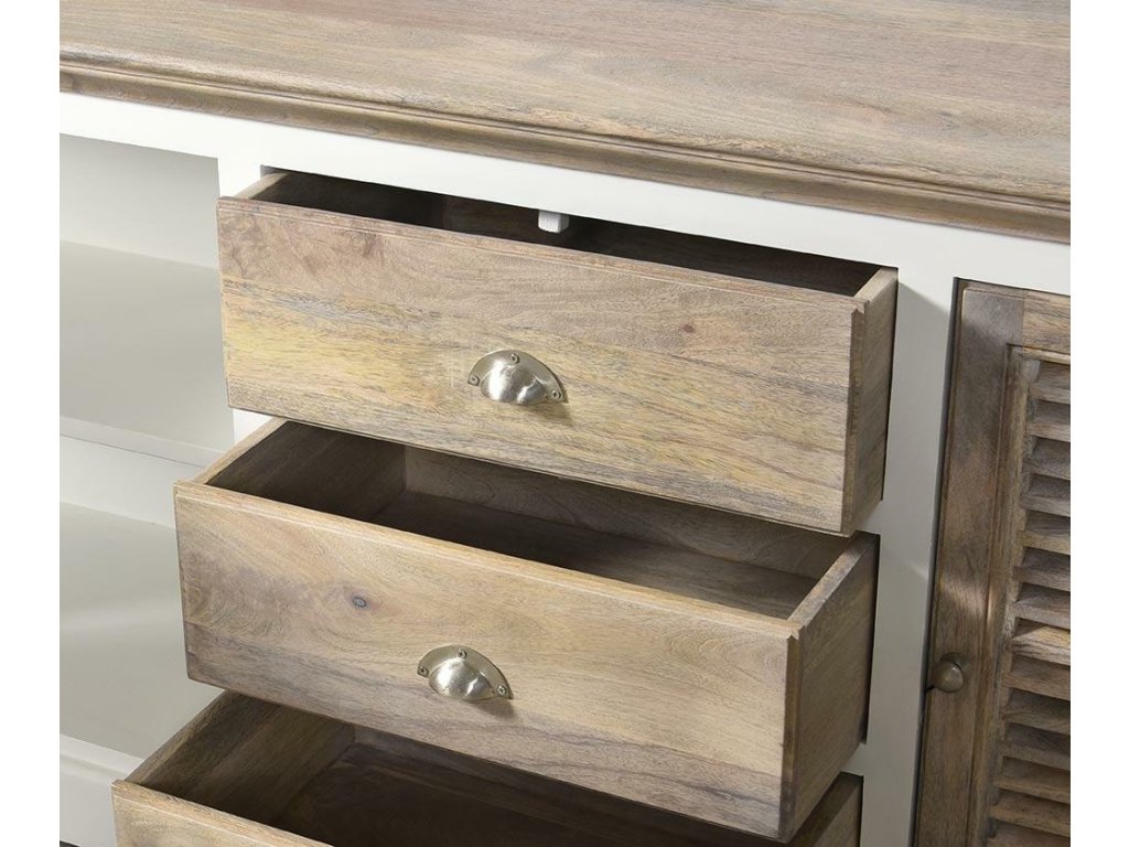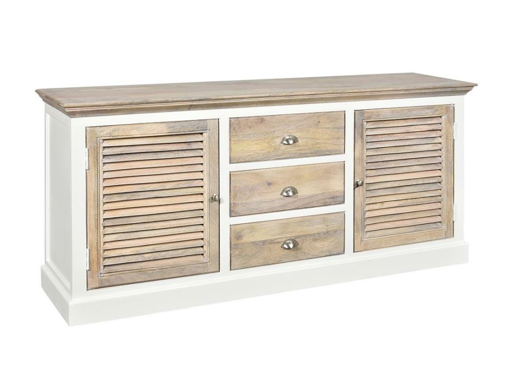 Dřevěná stylová komoda se zásuvkami a dvířkyve středomořském styluBílá patina, lamelová dvířkazvýrazněná strukura mangového dřeva v kombinaci s bíloukombinace dřeva mangového a MDFRozměr : 183x48x84 cm