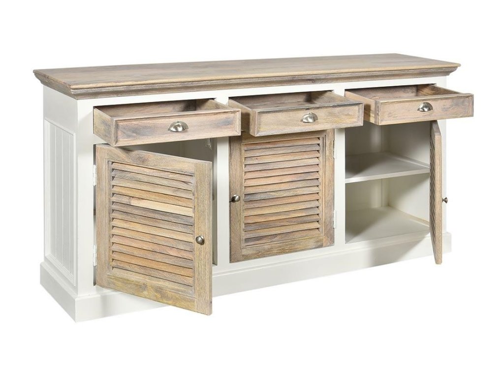 Dřevěná stylová komoda se zásuvkami a dvířkyve středomořském styluBílá patina, lamelová dvířkazvýrazněná strukura mangového dřeva v kombinaci s bíloukombinace dřeva mangového a MDFRozměr : 183x48x84 cm
