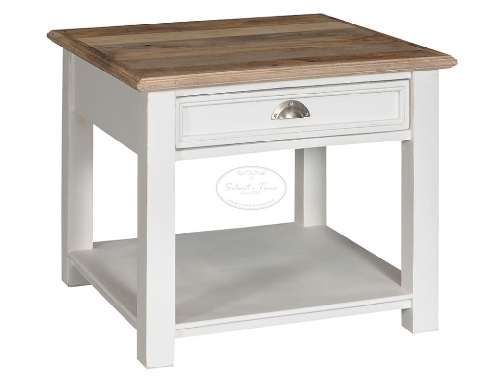Dřevěný stylový stolekve středomořském styluBílosmetanová barva, se zásuvkozvýrazněná strukura mangového dřeva kombinace dřeva a MDFRozměr :65x65x55 cm