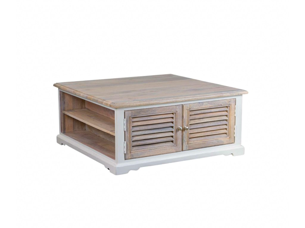 Dřevěný stylový stolekve středomořském styluBílosmetanová barva, lamelová dvířkazvýrazněná strukura mangového dřeva uvnitřkombinace dřeva a MDFRozměr : 100x100x45 cm