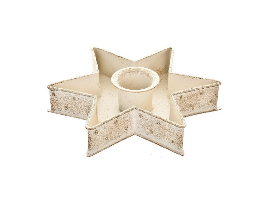 svícen z kovu s bílou patinoua zlatými flitramiRozměr: 12,5 x 12,5 x 2,5 cm