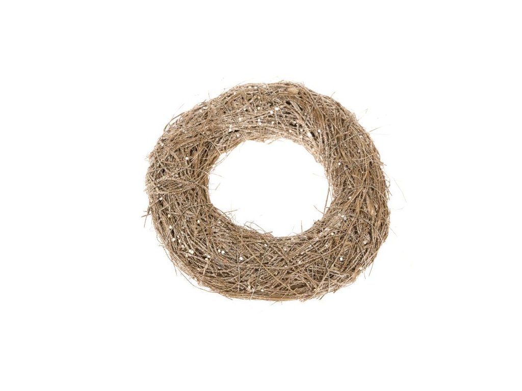 Jemný větvičkový věnec silně zlacenýs třpytkami.Rozměr: pr. 20 cm